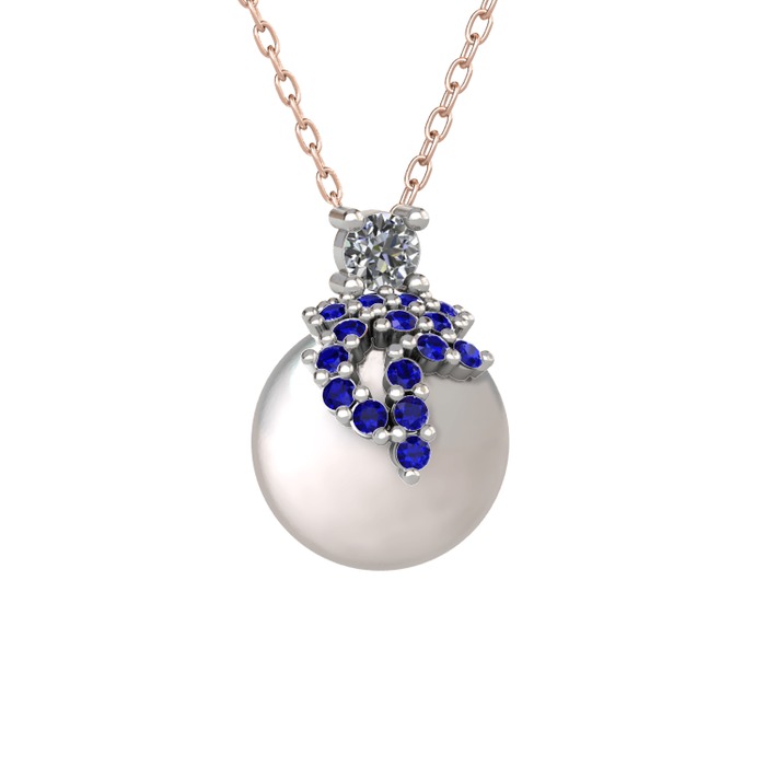 Pırlanta, lab safir ve inci 925 ayar gümüş kolye (0.11 karat, 40 cm rose altın rolo zincir)