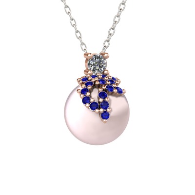 Pırlanta, lab safir ve pembe inci 8 ayar rose altın kolye (0.11 karat, 40 cm beyaz altın rolo zincir)