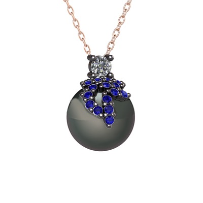 Pırlanta, lab safir ve siyah inci 925 ayar siyah rodyum kaplama gümüş kolye (0.11 karat, 40 cm rose altın rolo zincir)