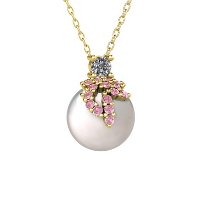 Pırlanta, pembe kuvars ve inci 18 ayar altın kolye (0.11 karat, 40 cm altın rolo zincir)