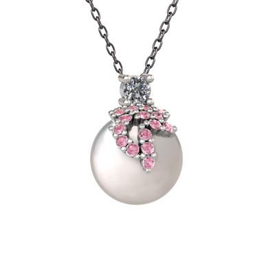 Pırlanta, pembe kuvars ve inci 18 ayar beyaz altın kolye (0.11 karat, 40 cm gümüş rolo zincir)