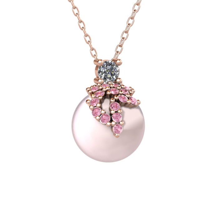 Pırlanta, pembe kuvars ve pembe inci 8 ayar rose altın kolye (0.11 karat, 40 cm rose altın rolo zincir)