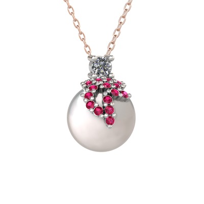 Pırlanta, rodolit garnet ve inci 14 ayar beyaz altın kolye (0.11 karat, 40 cm gümüş rolo zincir)