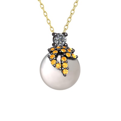 Pırlanta, sitrin ve inci 925 ayar siyah rodyum kaplama gümüş kolye (0.11 karat, 40 cm gümüş rolo zincir)