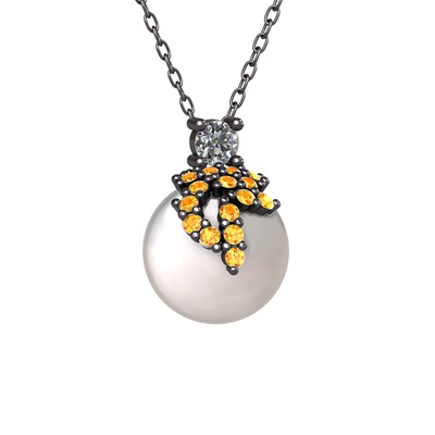 Pırlanta, sitrin ve inci 925 ayar siyah rodyum kaplama gümüş kolye (0.11 karat, 40 cm gümüş rolo zincir)