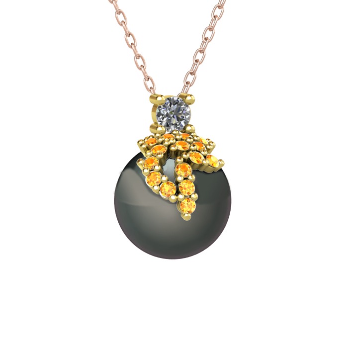 Pırlanta, sitrin ve siyah inci 8 ayar altın kolye (0.11 karat, 40 cm gümüş rolo zincir)