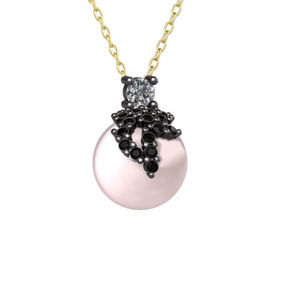 Pırlanta, siyah zirkon ve pembe inci 925 ayar siyah rodyum kaplama gümüş kolye (0.11 karat, 40 cm gümüş rolo zincir)