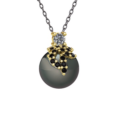 Pırlanta, siyah zirkon ve siyah inci 8 ayar altın kolye (0.11 karat, 40 cm gümüş rolo zincir)