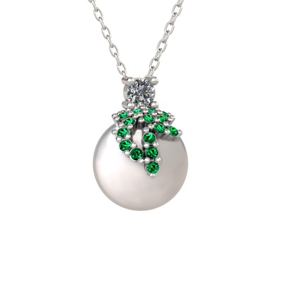 Pırlanta, yeşil kuvars ve inci 925 ayar gümüş kolye (0.11 karat, 40 cm beyaz altın rolo zincir)