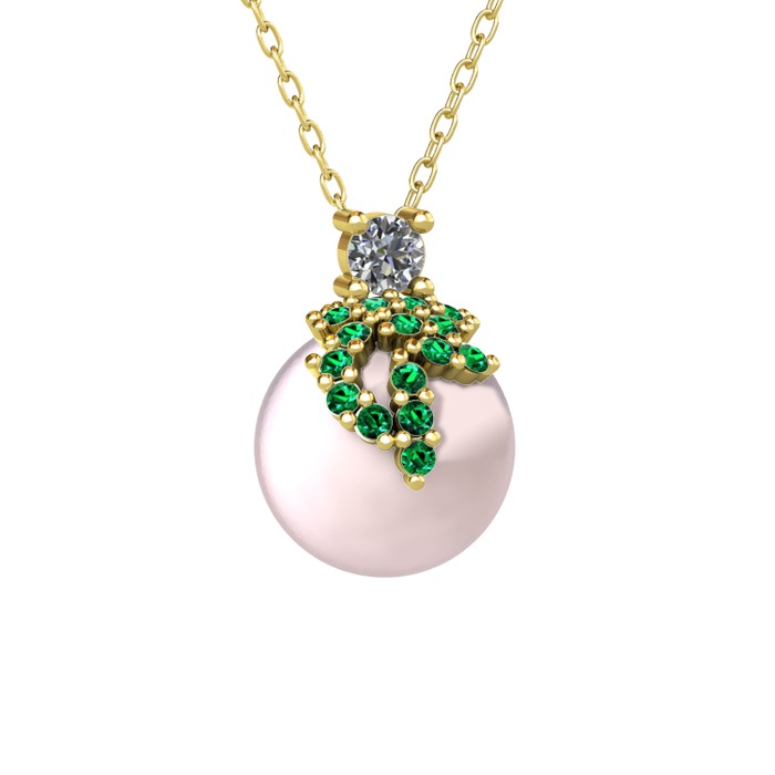 Pırlanta, yeşil kuvars ve pembe inci 925 ayar altın kaplama gümüş kolye (0.11 karat, 40 cm altın rolo zincir)