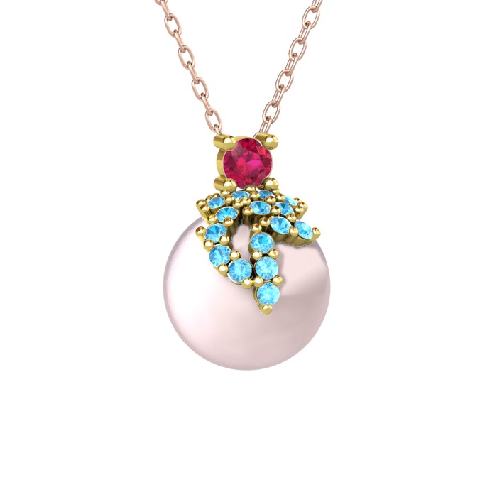 Rodolit garnet, akuamarin ve pembe inci 18 ayar altın kolye (40 cm rose altın rolo zincir)