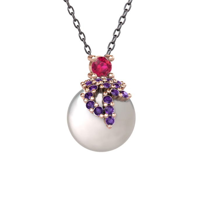 Rodolit garnet, ametist ve inci 8 ayar rose altın kolye (40 cm gümüş rolo zincir)