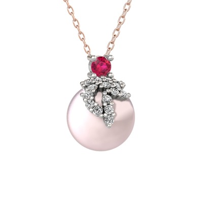 Rodolit garnet, beyaz zirkon ve pembe inci 8 ayar beyaz altın kolye (40 cm rose altın rolo zincir)