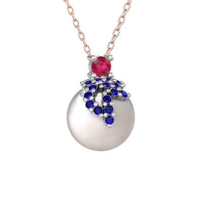 Rodolit garnet, lab safir ve inci 18 ayar beyaz altın kolye (40 cm rose altın rolo zincir)