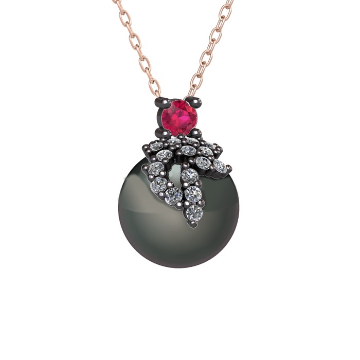 Rodolit garnet, pırlanta ve siyah inci 925 ayar siyah rodyum kaplama gümüş kolye (0.176 karat, 40 cm gümüş rolo zincir)