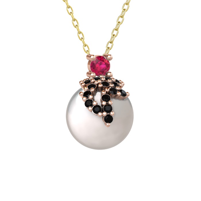 Rodolit garnet, siyah zirkon ve inci 14 ayar rose altın kolye (40 cm altın rolo zincir)
