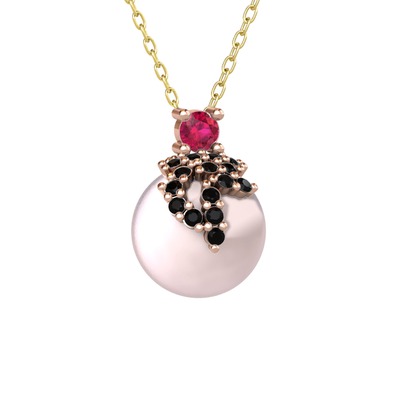 Rodolit garnet, siyah zirkon ve pembe inci 14 ayar rose altın kolye (40 cm gümüş rolo zincir)