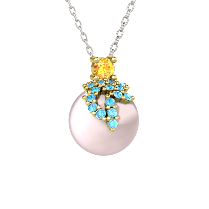 Sitrin, akuamarin ve pembe inci 8 ayar altın kolye (40 cm beyaz altın rolo zincir)