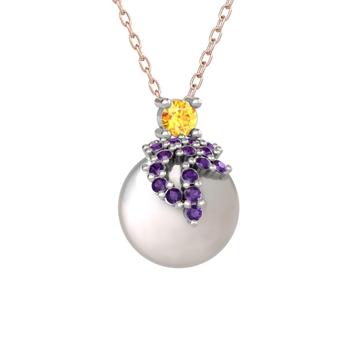 Sitrin, ametist ve inci 14 ayar beyaz altın kolye (40 cm rose altın rolo zincir)