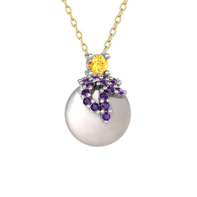 Sitrin, ametist ve inci 8 ayar beyaz altın kolye (40 cm gümüş rolo zincir)