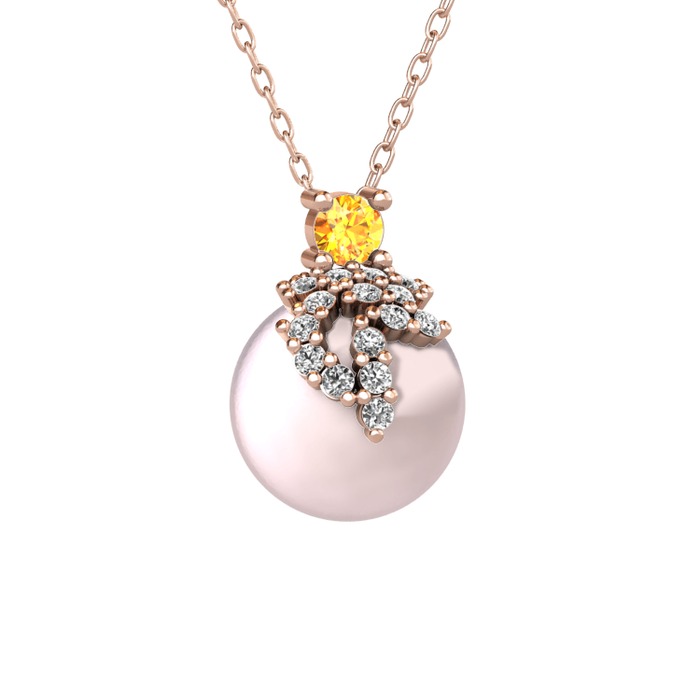 Sitrin, beyaz zirkon ve pembe inci 14 ayar rose altın kolye (40 cm rose altın rolo zincir)