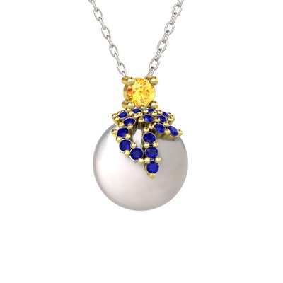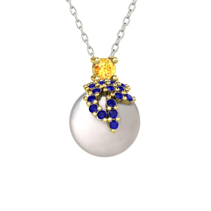 Sitrin, lab safir ve inci 14 ayar altın kolye (40 cm beyaz altın rolo zincir)