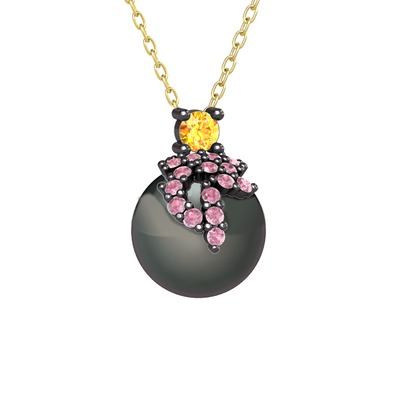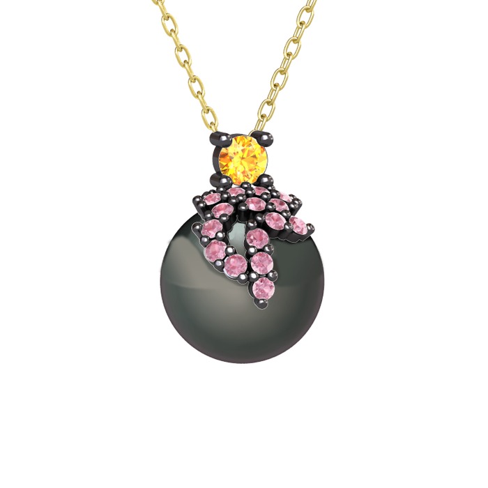 Sitrin, pembe kuvars ve siyah inci 925 ayar siyah rodyum kaplama gümüş kolye (40 cm altın rolo zincir)