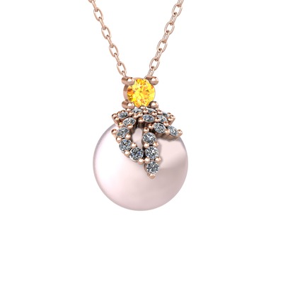 Sitrin, pırlanta ve pembe inci 18 ayar rose altın kolye (0.176 karat, 40 cm gümüş rolo zincir)