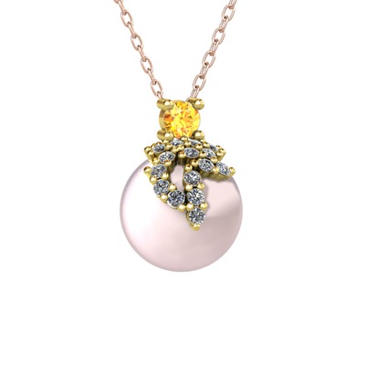 Sitrin, pırlanta ve pembe inci 8 ayar altın kolye (0.176 karat, 40 cm gümüş rolo zincir)