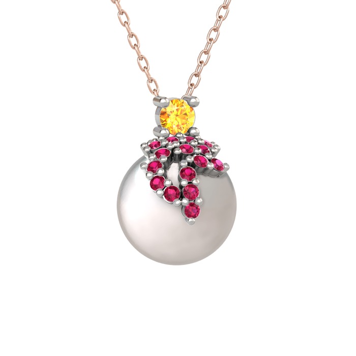 Sitrin, rodolit garnet ve inci 14 ayar beyaz altın kolye (40 cm gümüş rolo zincir)