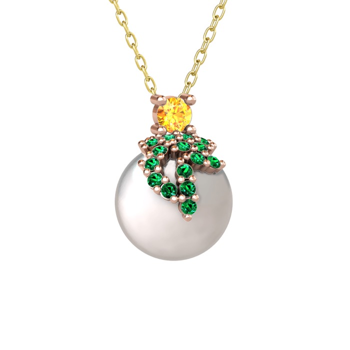 Sitrin, yeşil kuvars ve inci 14 ayar rose altın kolye (40 cm altın rolo zincir)