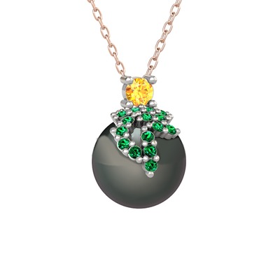 Sitrin, yeşil kuvars ve siyah inci 18 ayar beyaz altın kolye (40 cm rose altın rolo zincir)