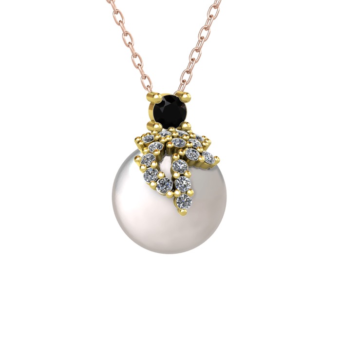Siyah zirkon, pırlanta ve inci 18 ayar altın kolye (0.176 karat, 40 cm rose altın rolo zincir)