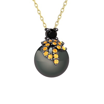 Siyah zirkon, sitrin ve siyah inci 925 ayar siyah rodyum kaplama gümüş kolye (40 cm altın rolo zincir)