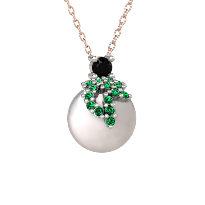 Siyah zirkon, yeşil kuvars ve inci 18 ayar beyaz altın kolye (40 cm rose altın rolo zincir)