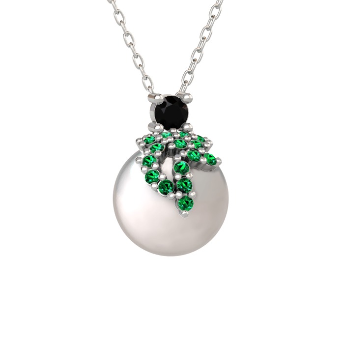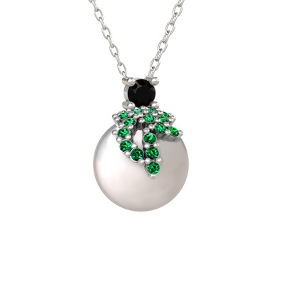 Siyah zirkon, yeşil kuvars ve inci 8 ayar beyaz altın kolye (40 cm beyaz altın rolo zincir)