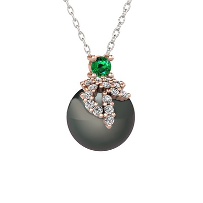 Yeşil kuvars, beyaz zirkon ve siyah inci 18 ayar rose altın kolye (40 cm gümüş rolo zincir)