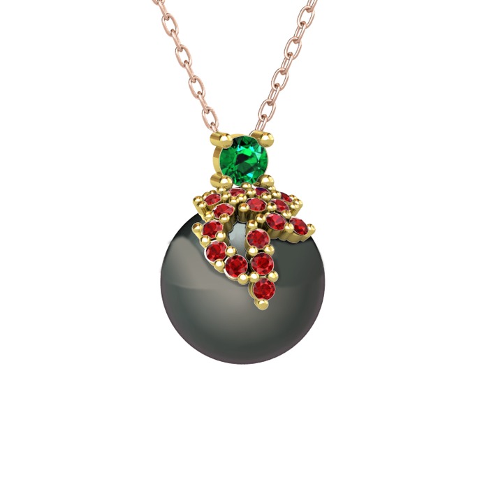 Yeşil kuvars, garnet ve siyah inci 14 ayar altın kolye (40 cm rose altın rolo zincir)