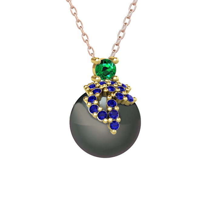 Yeşil kuvars, lab safir ve siyah inci 14 ayar altın kolye (40 cm rose altın rolo zincir)