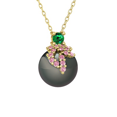 Yeşil kuvars, pembe kuvars ve siyah inci 14 ayar altın kolye (40 cm gümüş rolo zincir)