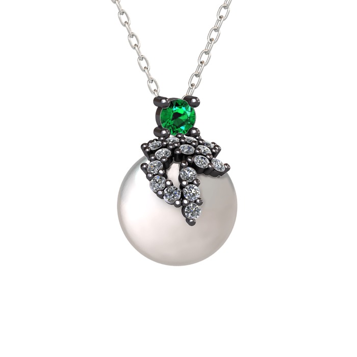 Yeşil kuvars, pırlanta ve inci 925 ayar siyah rodyum kaplama gümüş kolye (0.176 karat, 40 cm beyaz altın rolo zincir)