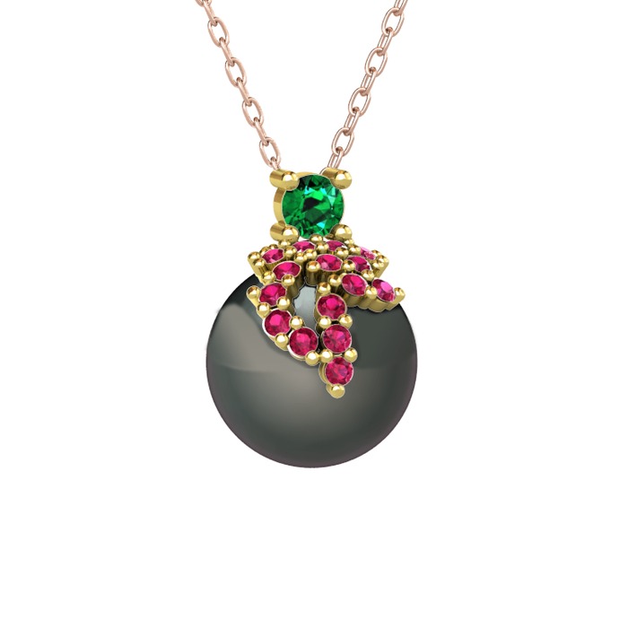 Yeşil kuvars, rodolit garnet ve siyah inci 925 ayar altın kaplama gümüş kolye (40 cm rose altın rolo zincir)