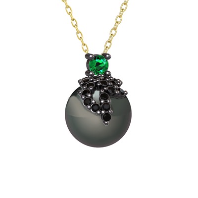 Yeşil kuvars, siyah zirkon ve siyah inci 925 ayar siyah rodyum kaplama gümüş kolye (40 cm altın rolo zincir)