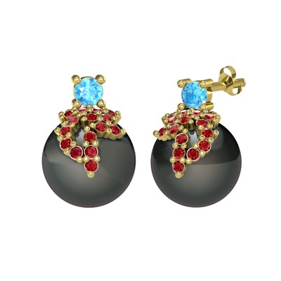 Akuamarin, garnet ve siyah inci 14 ayar altın küpe