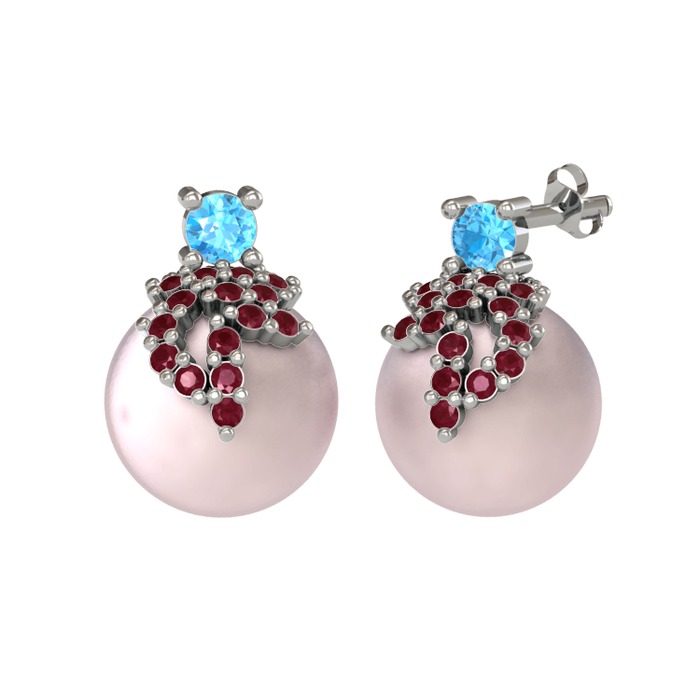 Akuamarin, kök yakut ve pembe inci 14 ayar beyaz altın küpe