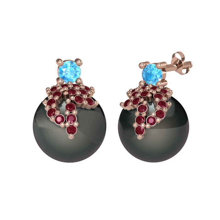 Akuamarin, kök yakut ve siyah inci 925 ayar rose altın kaplama gümüş küpe