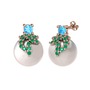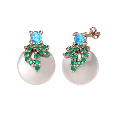 Akuamarin, kök zümrüt ve inci 8 ayar rose altın küpe