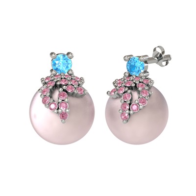 Akuamarin, pembe kuvars ve pembe inci 14 ayar beyaz altın küpe