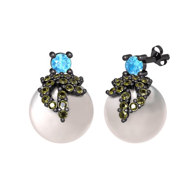 Akuamarin, peridot ve inci 925 ayar siyah rodyum kaplama gümüş küpe