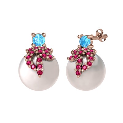 Akuamarin, rodolit garnet ve inci 14 ayar rose altın küpe